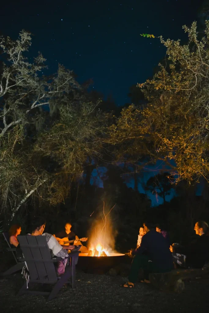 Indoor studios set beneath towering pines, surrounded by hammock lounges, picnic areas, and a bonfire circle. Built for yoga, meditation, workshops, breakout sessions, and cacao ceremonies.
