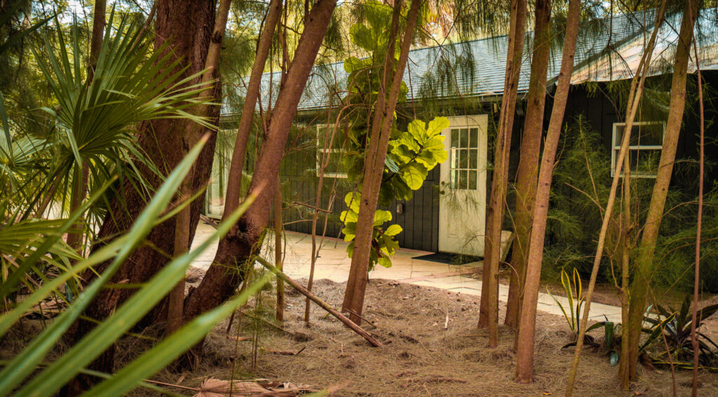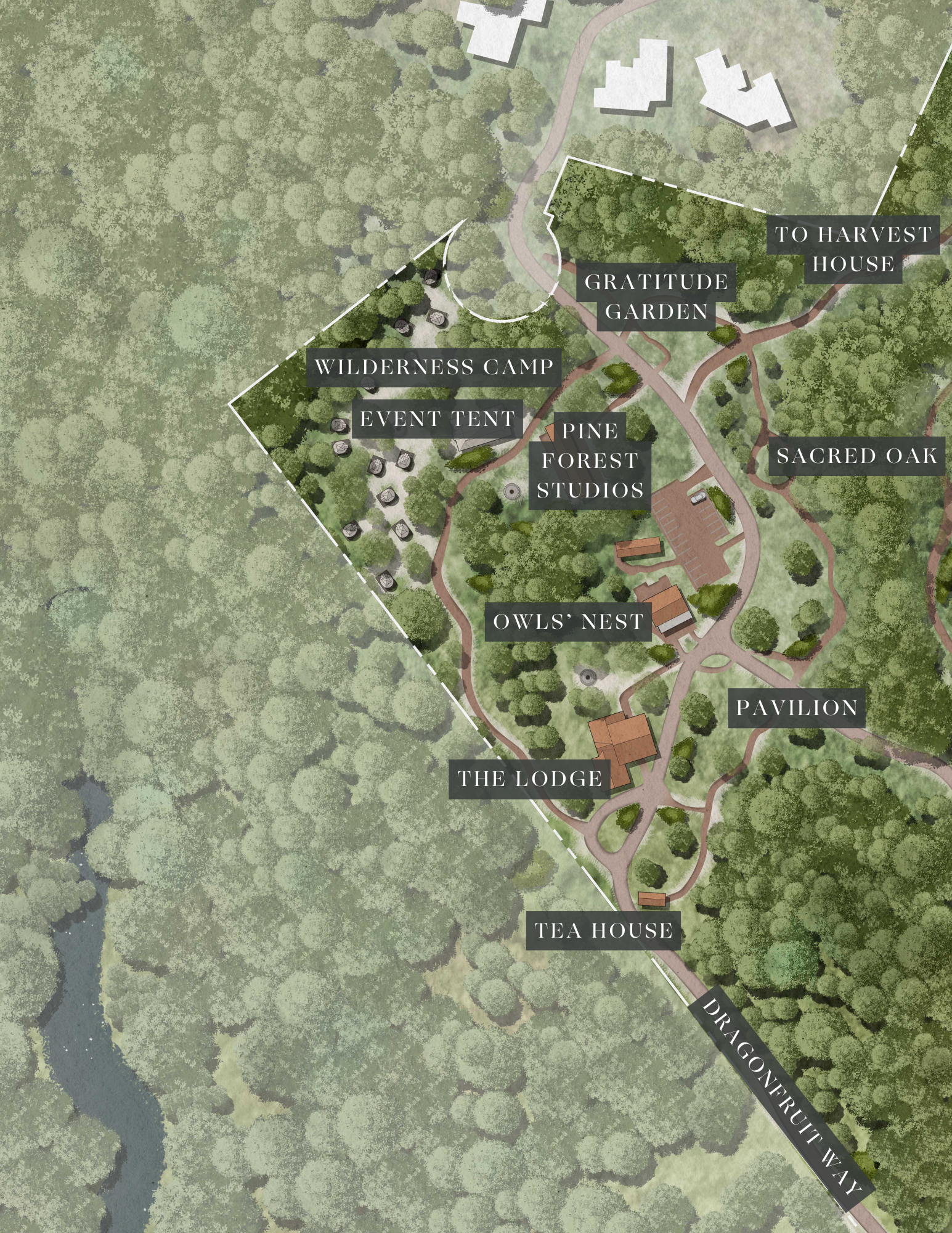 The Harvest House, Pine Forest Studios and Wilderness Event Tent are located within The Estuary at ChoZen Retreat. The Estuary is a lush and picturesque neighborhood nestled along the tranquil banks of the meandering San Sebastian River. It offers a perfect blend of natural beauty and urban convenience. Residents and visitors alike can enjoy scenic walks, communal dining, and a close-knit atmosphere within this charming enclave.