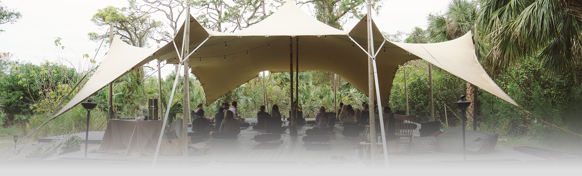 An open-air safari-style canvas tent set within untamed Florida wilderness. Wild, atmospheric, and unlike any venue in the region. Ideal for evening events, ceremonies, outdoor dining, and group gatherings under the stars.